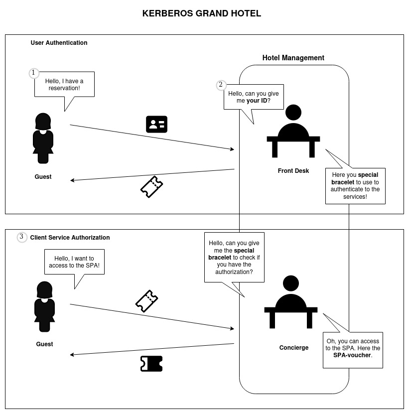 Kerberos, though a complex topic, can be better understood by drawing parallels with a hotel analogy. Imagine the Kerberos system as a hotel, and its various components as essential services within this hotel.