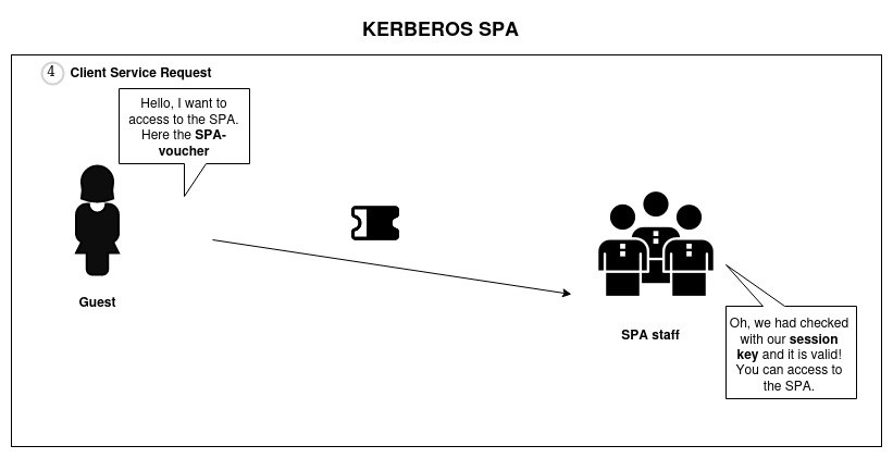 I know, I know! There is no bracelet in the image but I'm not able to draw it! I'm sorry 😔 - Accessing the Service (Resource): With the spa service ticket in hand, the guest (user) goes to the spa entrance (service) and presents the service ticket to the spa staff (resource). The spa staff (resource) checks the service ticket and validates it by decrypting it with their own key (session key). If the ticket is valid, the guest (user) is allowed entry to the spa (resource) without revealing their original identification (username and password).